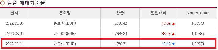 오늘 달러 하락했네요.서울외환중개3/8~3/11 EUR 일별 매매기준