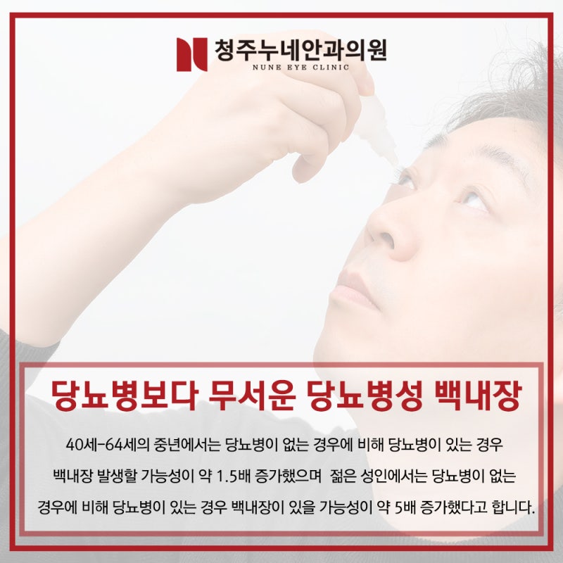 당뇨병 환자는 일반인에 비해 발병 시기가 빠르고 40~50대에 백내장이 찾아올 수 있습니다.경우에 따라서는 20~30대 청년기에 나타나는 경우도 있고, 최근 들어서는 30, 40대 발병률이 높아지고 있는 추세입니다.