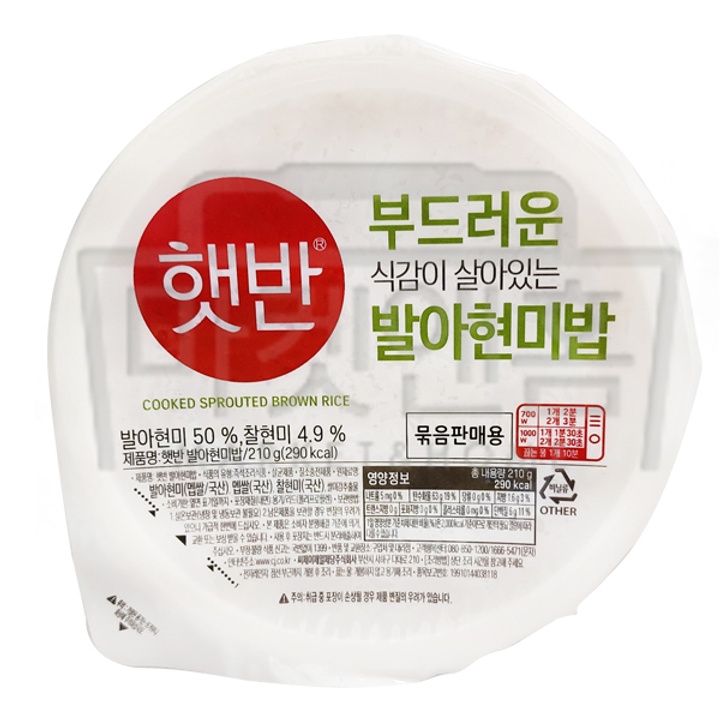 인스턴트 밥의 칼로리는 총 내용량 210g에 295kcal입니다.발아현미가 50% 함유되어 있네요~ 영양성분은 나트륨 5mg1%, 탄수화물 66g20%, 당류 0g0%, 지방 1.0g2%, 트랜스지방 0g0%, 포화지방 0.5g3%, 콜레스테롤 0mg0%, 단백질 5g9%입니다~! 조리방법은 전자레인지에서 1개 2분, 2개 3분!끓는 물에 10분이요~